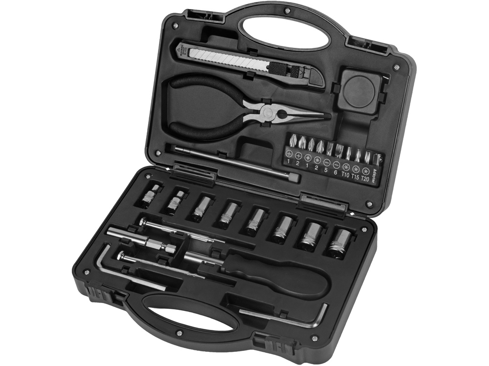 Набор инструментов 28. В набор из 28 инструментов входит ручка отвертки с 9-ю насадками (PH1, PH2, PZ1, PZ2, SL5, SL6, T10, T15, T20), адаптеры и ключи, насадки (5mm, 6mm, 7mm, 8mm, 9mm, 10mm, 11mm, 12mm), выдвижной нож инструмент, длинные плоскогубцы, телескопический магнитный инструмент, 2 шестигранных ключа (4 мм, 5мм), 2 отвертки (PH2, SL2) и рулетка. Набор упакован в коробку STAC. АБС и сталь. Тампопечать (1 цвет (цветные изделия)) на данный товар осуществляется бесплатно. Оплачивается только настройка оборудования в размере 4500 рублей на весь тираж.
